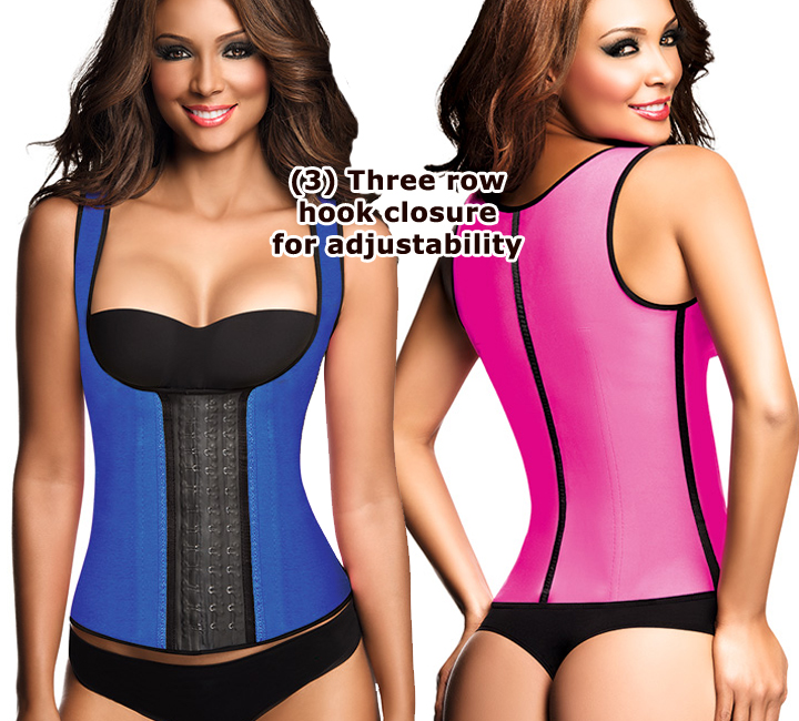 Description: This vest not only compresses your waist and abdomen - it slowly takes you to your target figure by making you sweat with its internal Latex lining. Perfect for exercising, walking and for work. Shown in Blue and Fuchsia